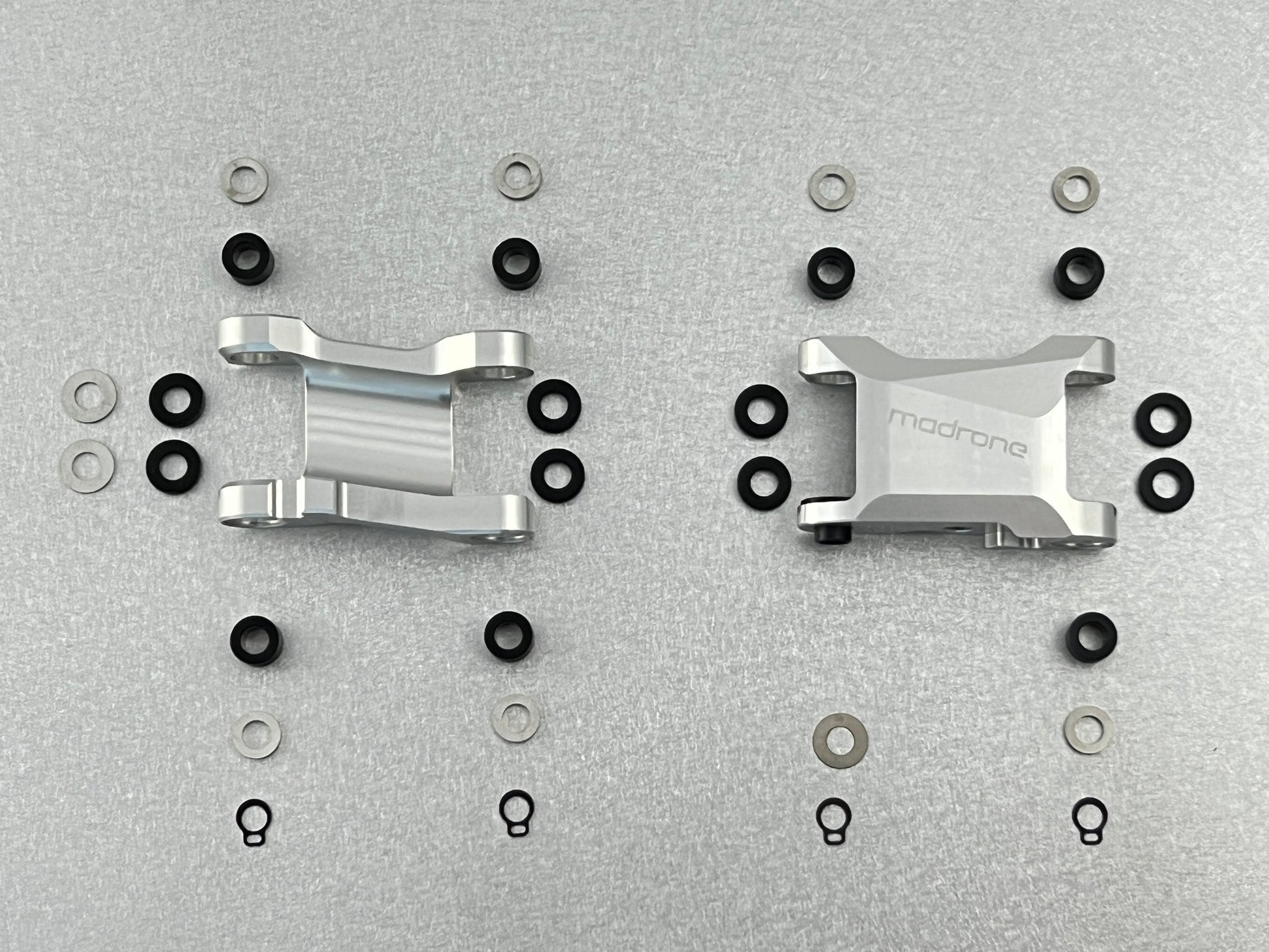 Durable, precise, and rebuildable. Our parallelogram links are CNC machined from 6061-T6 aluminum, improving the strength and stiffness compared to the stock parts. Plus, our bushings are made from a low friction polymer and have more surface area than the stock bushings, giving them a long life. The Missing Links add less than 5 grams compared to the stock links.